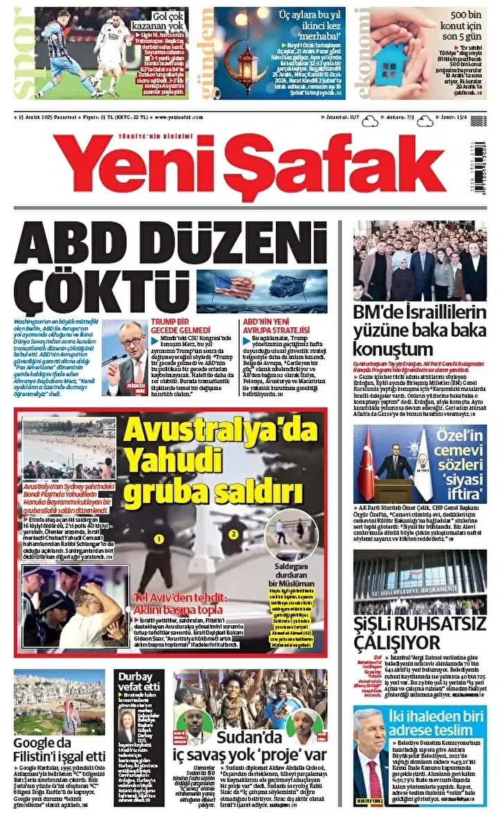 Yeni Şafak Gazetesi'nin 15 Aralık 2025 tarihli sayısına hoş geldiniz. Gündem, spor ve ekonomi sayfalarımızda bugünün öne çıkan haberlerini keşfedin.