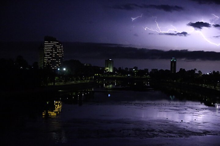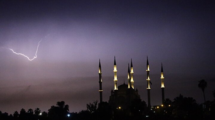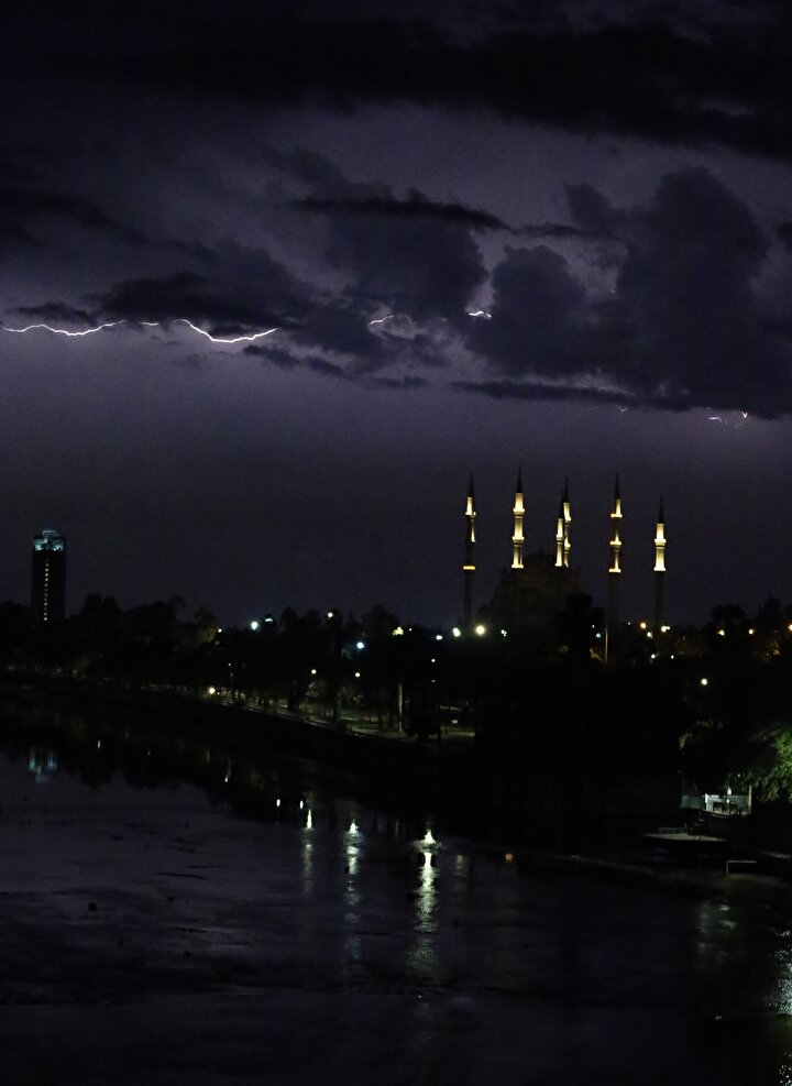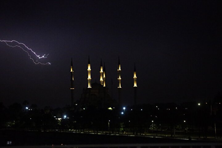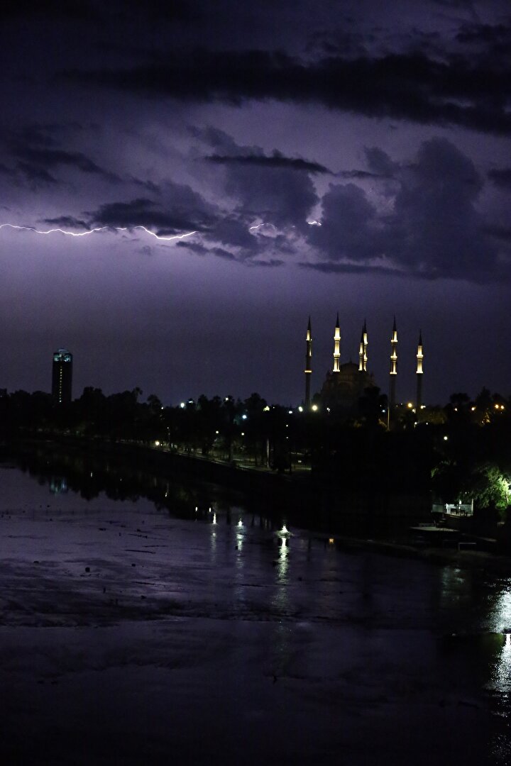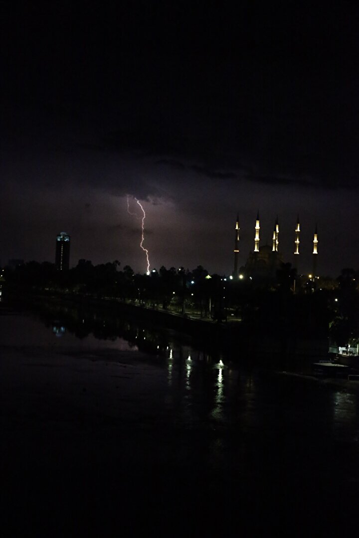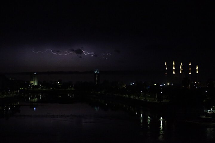 Adana'da, yağışla birlikte gökyüzünde çakan şimşekler, Seyhan Nehri ve Sabancı Merkez Camisi ile güzel görüntü oluşturdu.