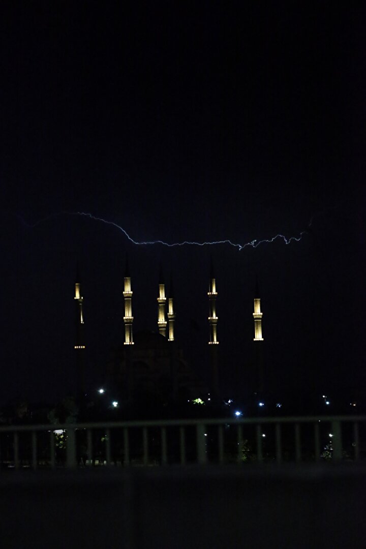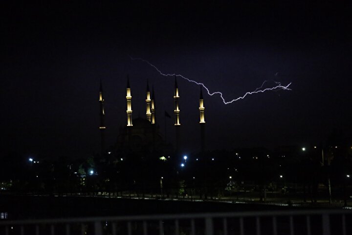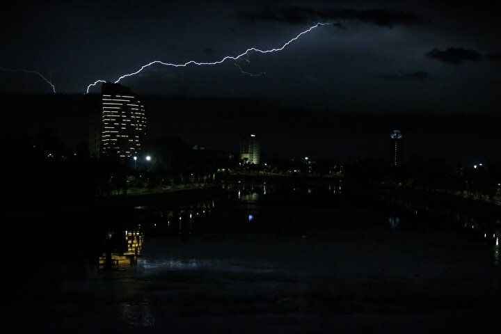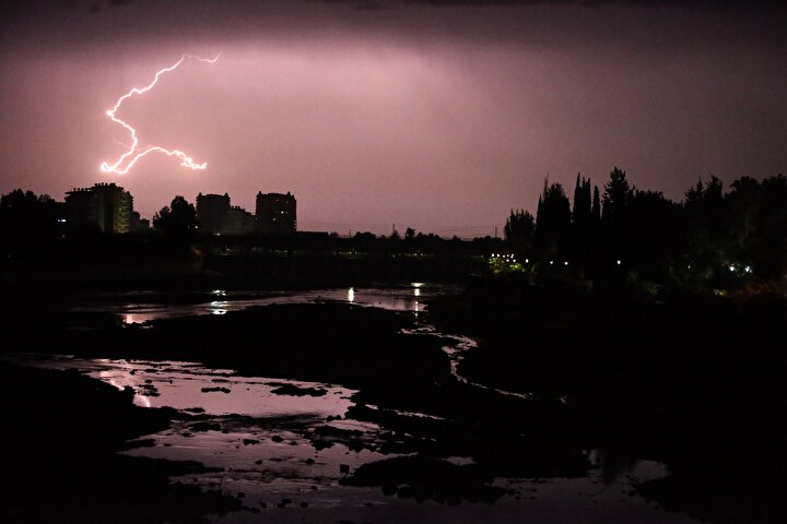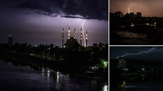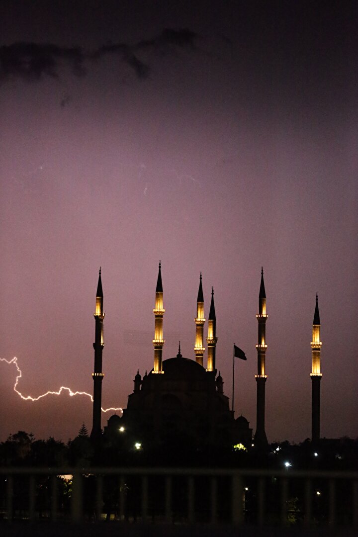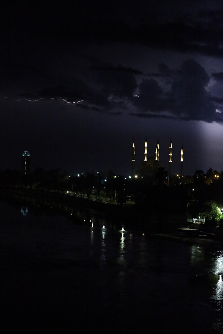 Adana'da, yağışla birlikte gökyüzünde çakan şimşekler, Seyhan Nehri ve Sabancı Merkez Camisi ile güzel görüntü oluşturdu.