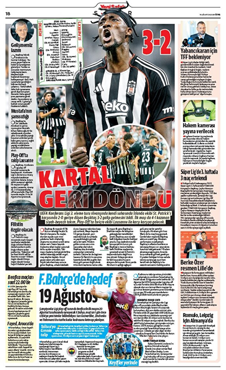 UEFA Konferans Ligi 3. eleme turu rövanşında kendi sahasında İrlanda ekibi St. Patrick's karşısında 2-0 geriye düşen Beşiktaş 3-2 galip gelmesini bildi. İlk maçı da 4-1 kazanan siyah-beyazlı takım, Play-Off'ta İsviçre ekibi Lausanne ile karşı karşıya gelecek.