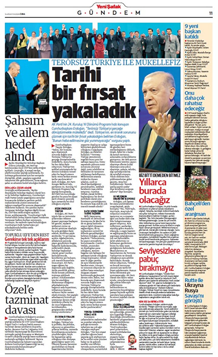 AK Parti’nin 24. Kuruluş Yıl Dönümü Programı'nda konuşan Cumhurbaşkanı Erdoğan, “Terörsüz Türkiye’yi gerçeğe dönüştürmekle mükellefiz” dedi. Türkiye'nin, en kronik sorununu çözmek için tarihi bir fırsat yakaladığını belirten Erdoğan, “Bunun heba edilmesine göz yummayacağız” vurgusu yaptı.