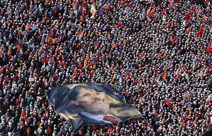 Başbakan Davutoğlu resmi hesabı üzerinden alandan çekilen tarihi kareleri yayınladı. Hakkında idam kararı verilen Mısır'ın ilk seçilmiş Cumhurbaşkanı Muhammed Mursi'nin dev posterinin yer aldığı kare de paylaşılan fotoğraflar arasında.