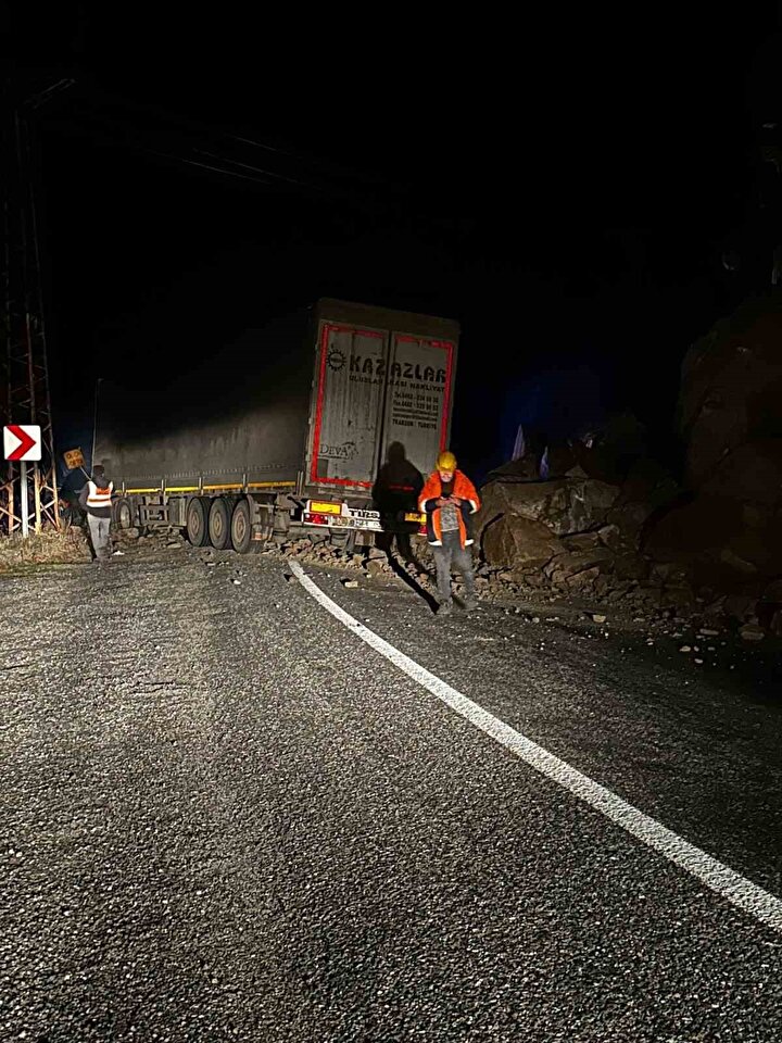 Yamaçtan kopan taş ve kaya parçaları karayoluna düştü.