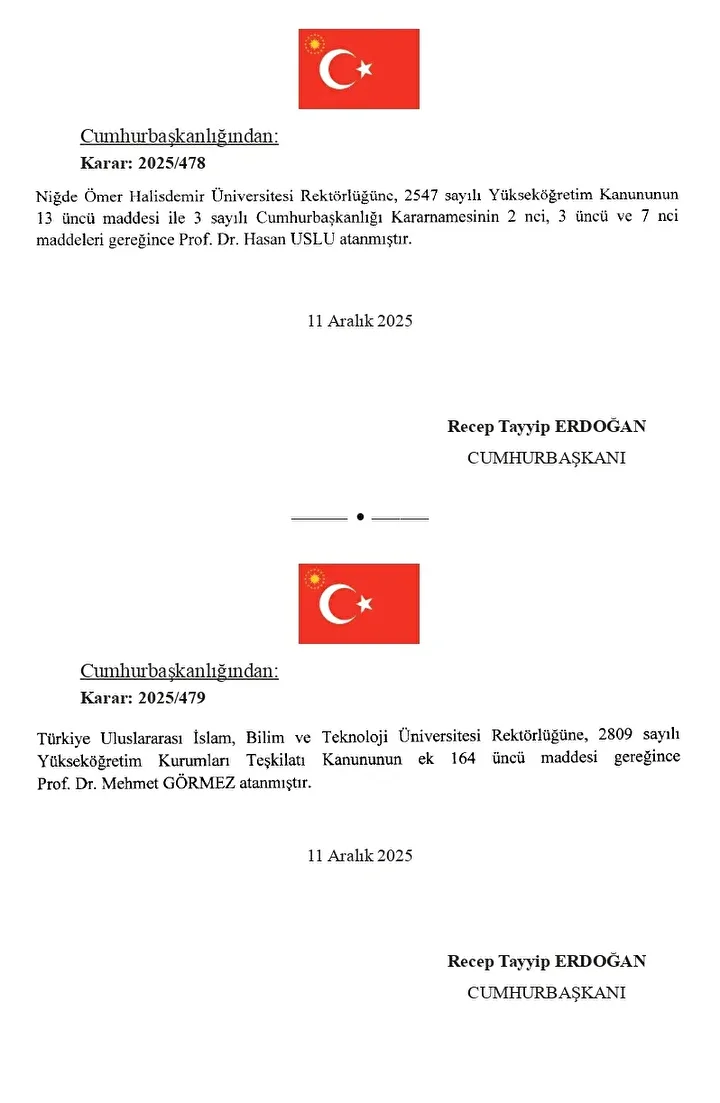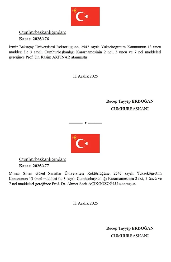 12 Aralık 2025 tarihli Resmi Gazete'de atama kararları yer aldı. Cumhurbaşkanı Recep Tayyip Erdoğan'ın imzasını taşıyan atama kararları kapsamında dokuz üniversiteye yeni rektör atandı.