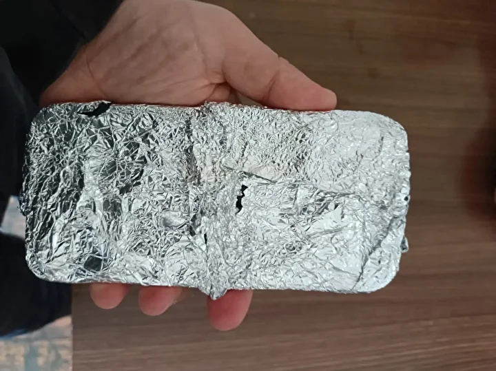 Adreslerde arama yapan polis ekipleri, şüphelilerin çaldığı cep telefonunu alüminyum folyoya sarılı halde buldu.