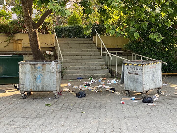 Çöp tenekelerinin etrafına yayılmış, yeşillik alanda bulunan çöpler ise belediye ekipleri tarafından temizleniyor.