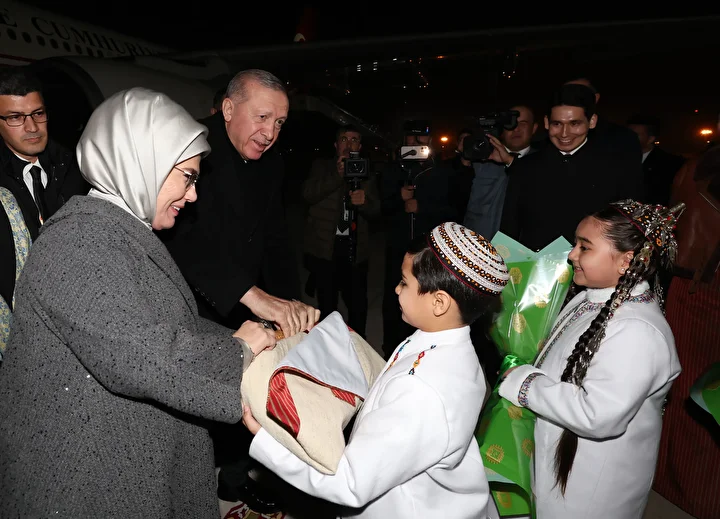 Cumhurbaşkanı Recep Tayyip Erdoğan, "Uluslararası Barış ve Güven Forumu"na katılmak üzere Türkmenistan'ın başkenti Aşkabat'ta ulaştı. "TUR" uçağıyla Aşkabat Uluslararası Havalimanı'na gelen Cumhurbaşkanı Erdoğan, resmi törenle karşılandı.