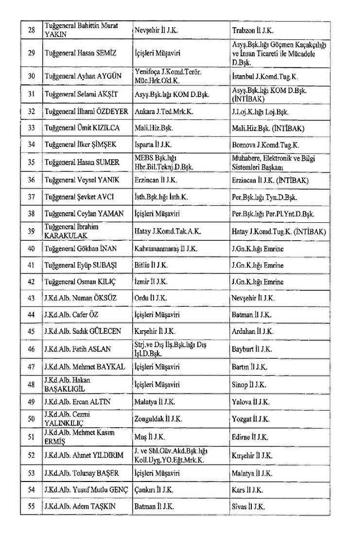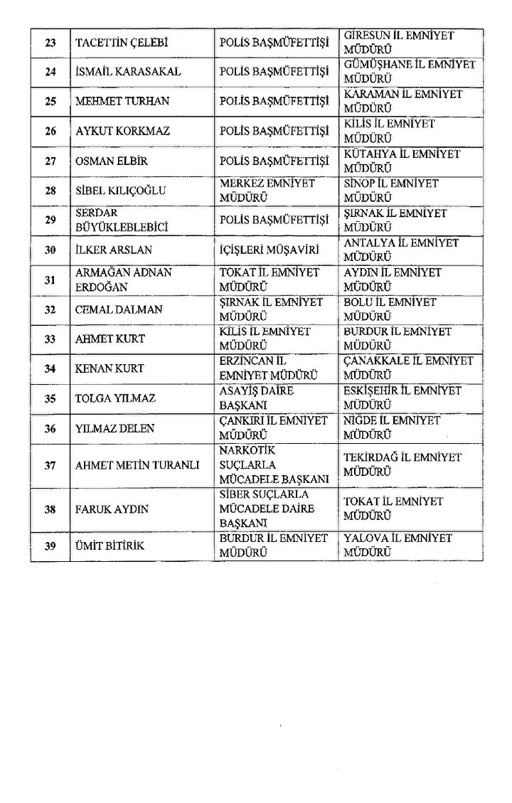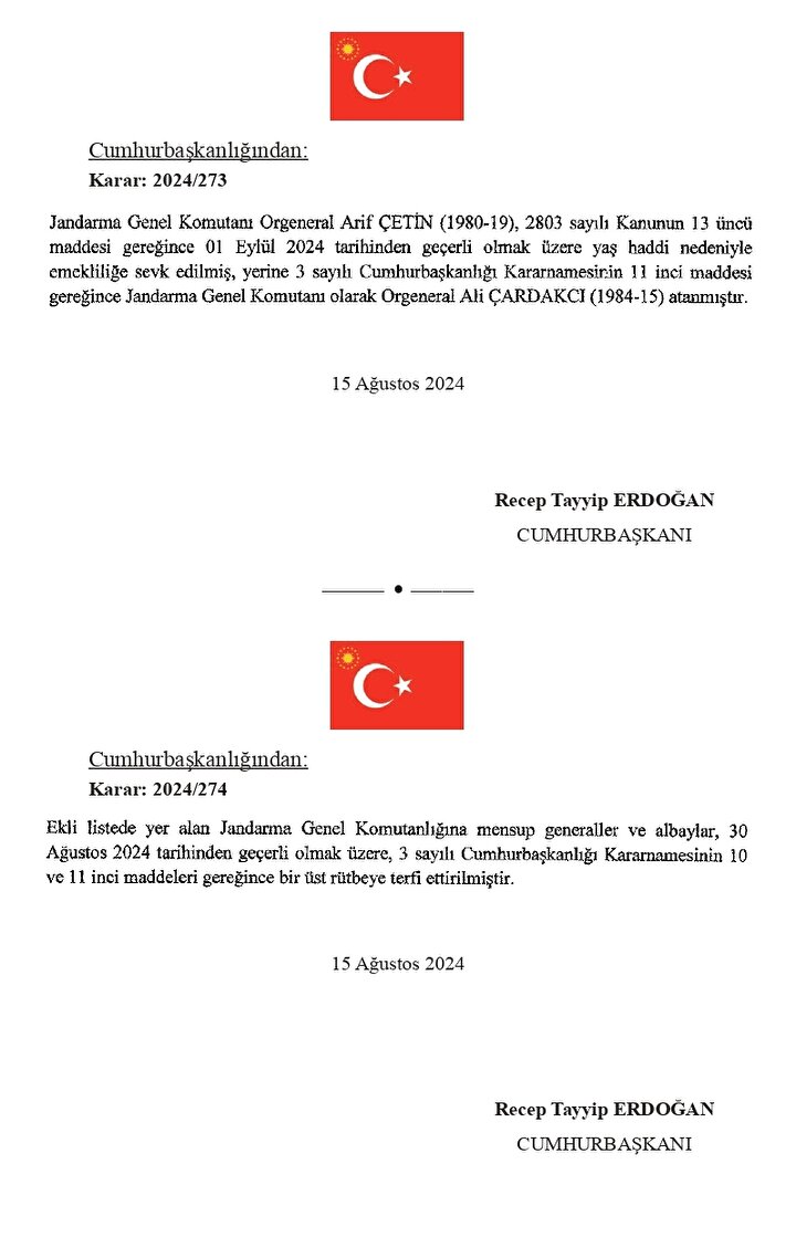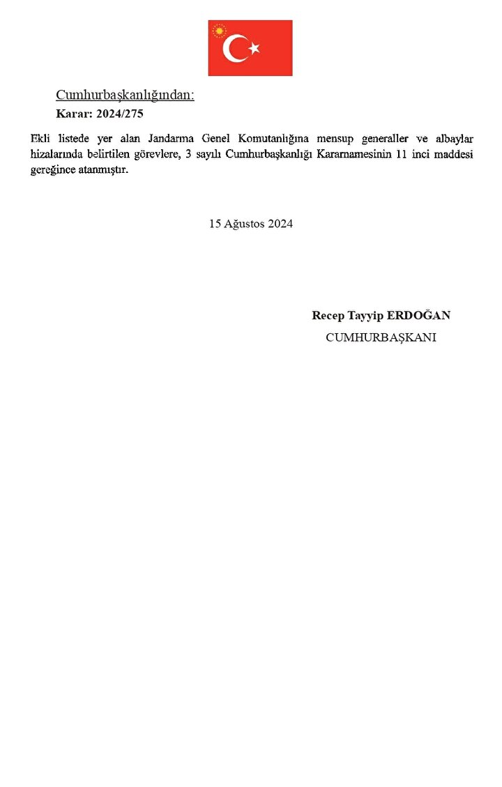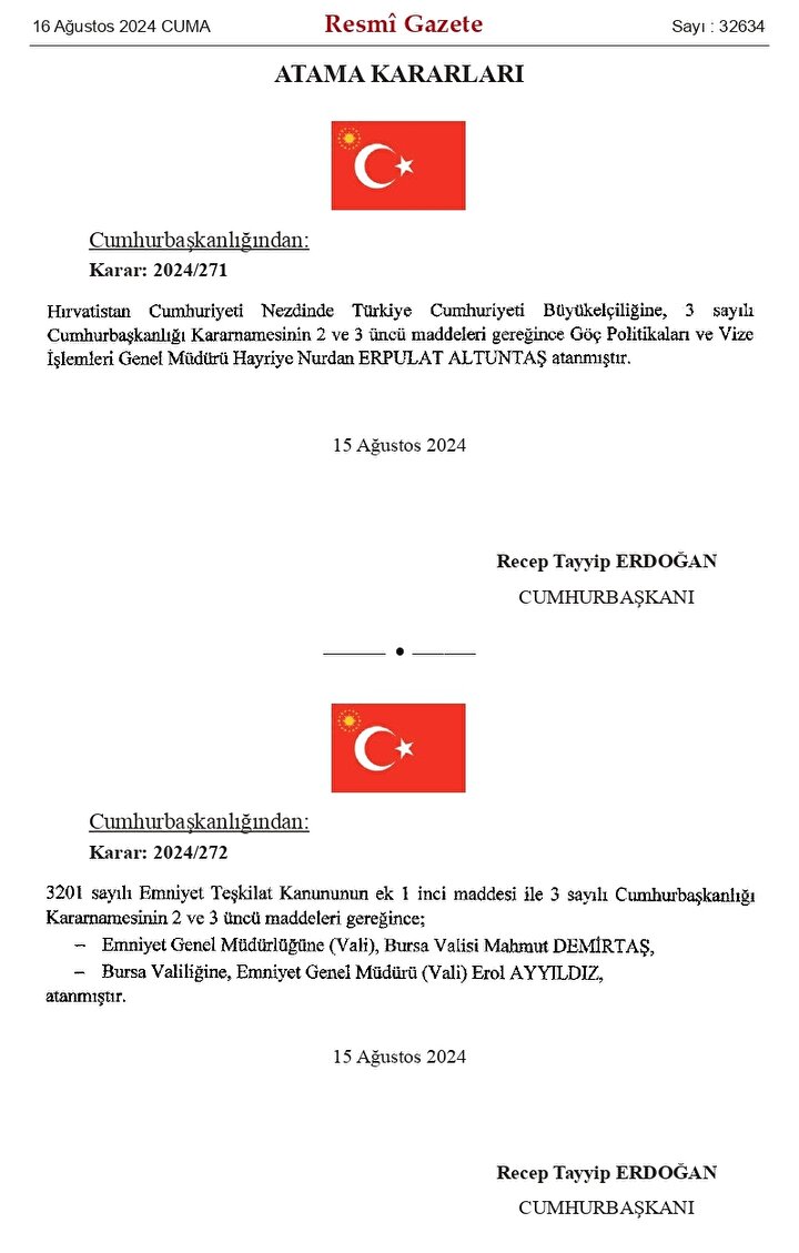 Cumhurbaşkanı Recep Tayyip Erdoğan'ın imzasını taşıyan atama kararları Resmi Gazete'de yayımlandı. Kararda komutan görevlendirmeleri, rektör atamaları, Emniyet Müdürlüğü'ne atamalar gerçekleşti. Karara göre, Emniyet Genel Müdürlüğü'ne Bursa Valisi Mahmut Demirtaş, Jandarma Genel Komutanlığı'na Orgeneral Ali Çardakcı, Hırvatistan Cumhuriyeti Nezdinde Türkiye Büyükelçiliğine Hayriye Nurdan Erpulat Altuntaş atandı.