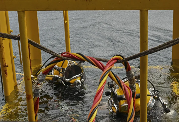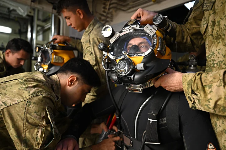 Kıyafetlerini giyinen, oksijen tüpleri ve başlıklarını takan dalgıçlar, ekibin yardımıyla asansöre benzeyen dalış steycine binerek komutla suya indirildi.