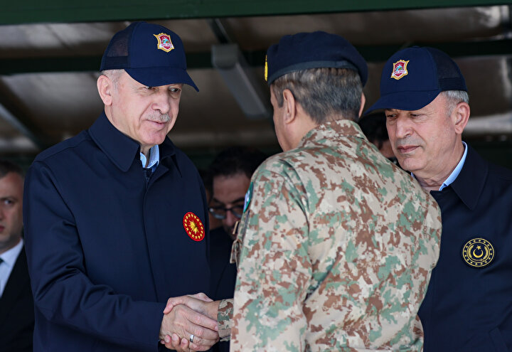 Üzerinde "Cumhurbaşkanlığı forsu" bulunan lacivert mont giyen, Efes 2022 yazılı şapka takan Erdoğan, burada tatbikatı izleyen misafir savunma bakanları ve genelkurmay başkanları ile bir süre sohbet etti.