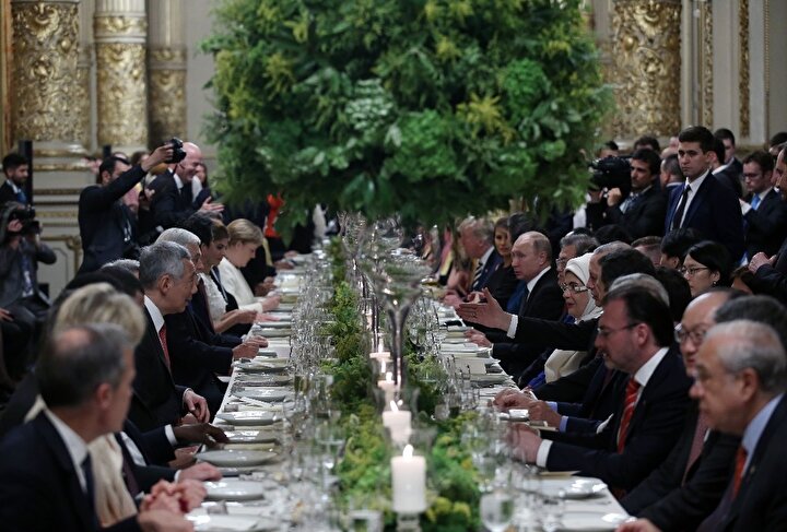 Arjantin Devlet Başkanı Mauriccio Macri, Buenos Aires'in en gözde mekanı Teatro Colon'da G20'ye katılan devlet başkanları onuruna bir yemek verdi. Liderler arasında Cumhurbaşkanı Erdoğan'ın helal yemek talebiyle, Fransa Cumhurbaşkanı Macron'un vejeteryan isteği dikkat çekti.