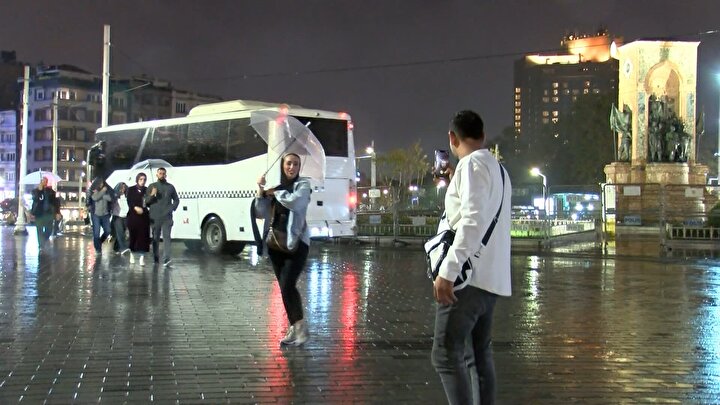 Taksim Meydanı'nda yağmurda ıslanmak istemeyenler otobüs duraklarına sığındı. Bazı vatandaşlar ve turistler ise yağmurun altına fotoğraf çektirmeyi ihmal etmedi.