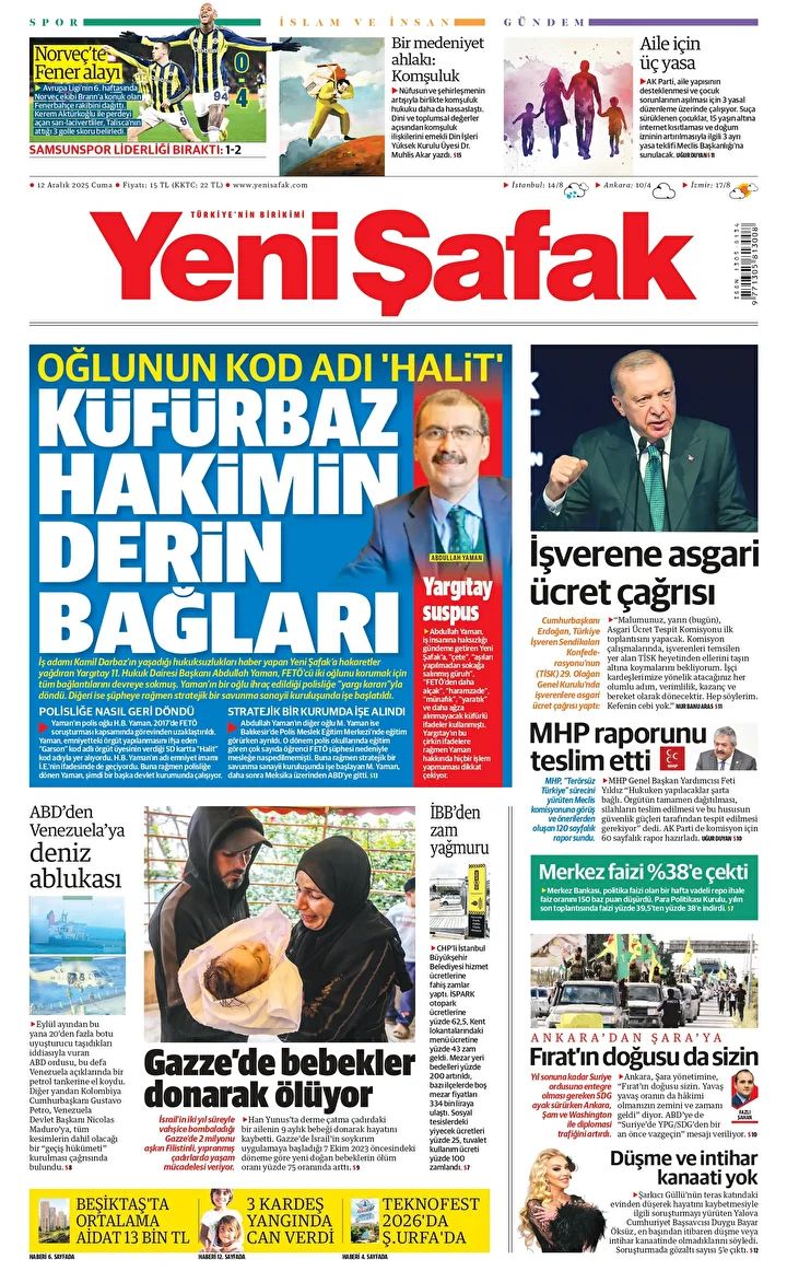Yeni Şafak Gazetesi'nin 12 Aralık 2025 tarihli birinci sayfasında yer alan manşet ve haberler...