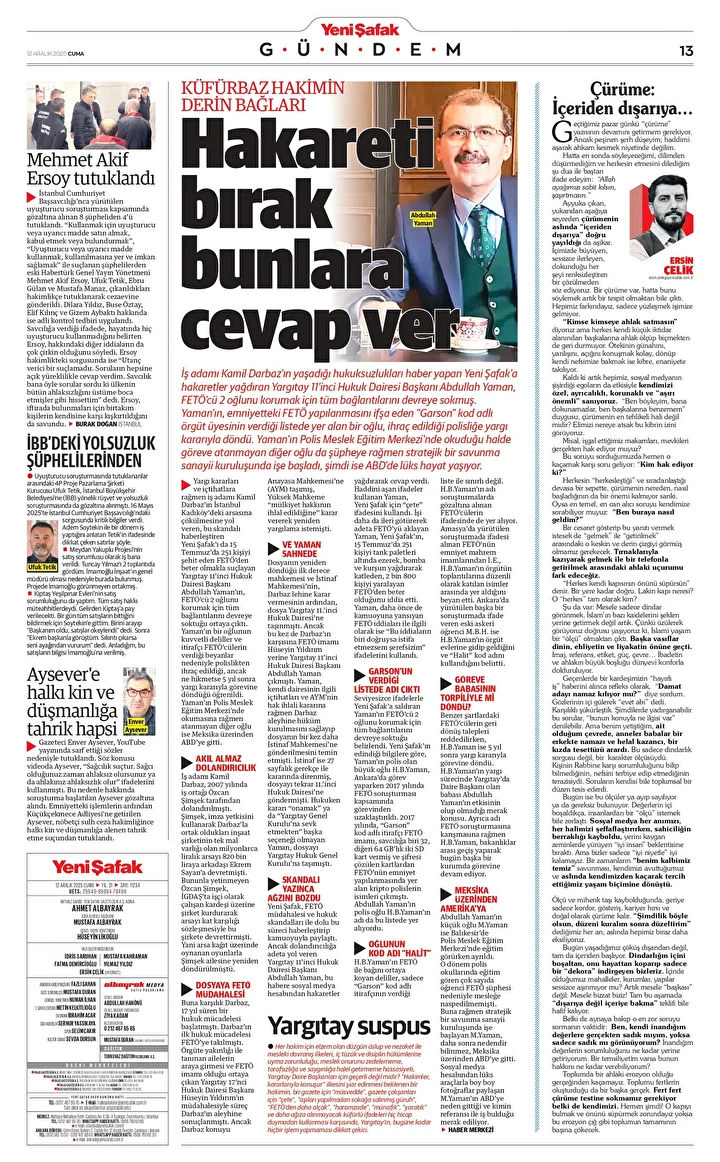 İş adamı Kamil Darbaz’ın yaşadığı hukuksuzlukları haber yapan Yeni Şafak’a hakaretler yağdıran Yargıtay 11’inci Hukuk Dairesi Başkanı Abdullah Yaman, FETÖ’cü 2 oğlunu korumak için tüm bağlantılarını devreye sokmuş. Yaman’ın, emniyetteki FETÖ yapılanmasını ifşa eden “Garson” kod adlı örgüt üyesinin verdiği listede yer alan bir oğlu, ihraç edildiği polisliğe yargı kararıyla döndü. Yaman'ın Polis Meslek Eğitim Merkezi'nde okuduğu halde göreve atanmayan diğer oğlu da şüpheye rağmen stratejik bir savunma sanayii kuruluşunda işe başladı, şimdi ise ABD’de lüks hayat yaşıyor.