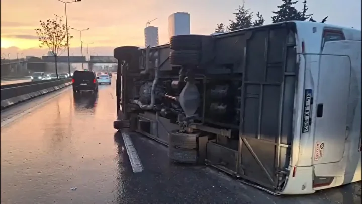 İstanbul Maltepe'de D-100 Karayolunda yağışın da etkisiyle kayganlaşan yolda havalimanı çalışanlarını taşıyan servis minibüsü devrildi.