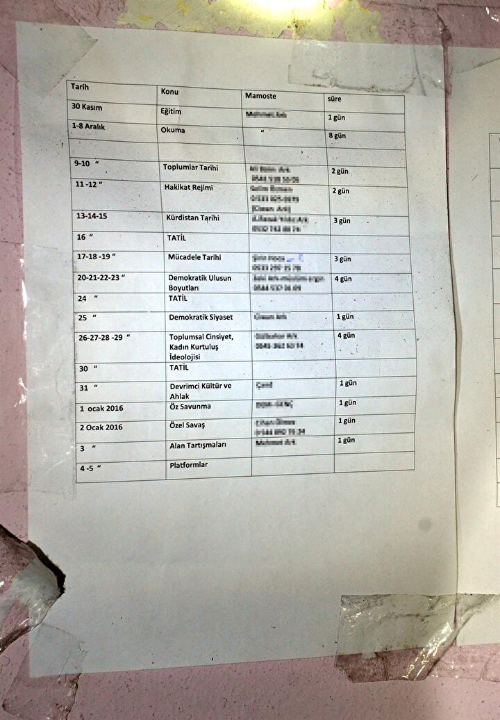 Duvardaki ders programında ise özel savaş, öz savunma, alan tartışmaları, demokratik ulusun boyutları ve mücadele tarihi ve çeşitli konuların yer aldığı görüldü.