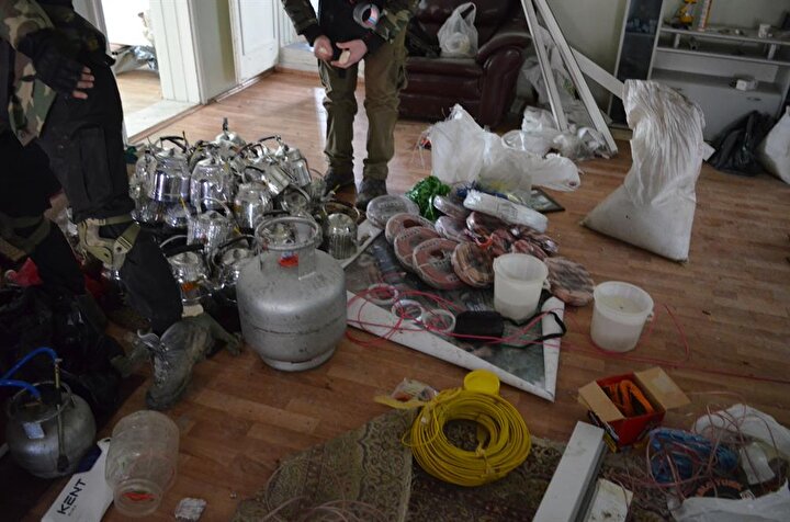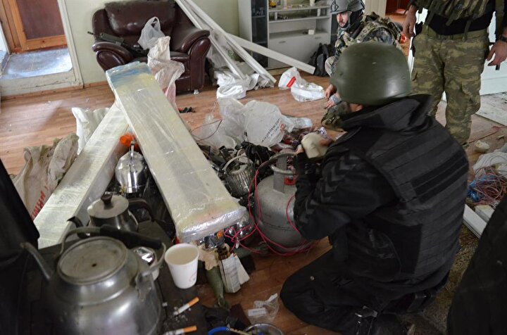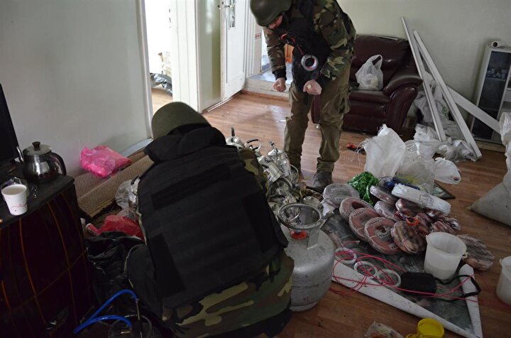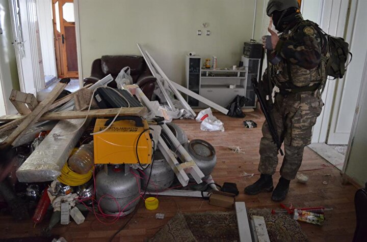 İçinde el yapımı patlayıcı düzenekleri olduğu belirlenen eve kontrollü giren bomba imha uzmanları, çok sayıda patlayıcı, silah ve mühimmat buldu.