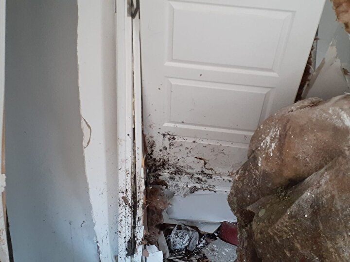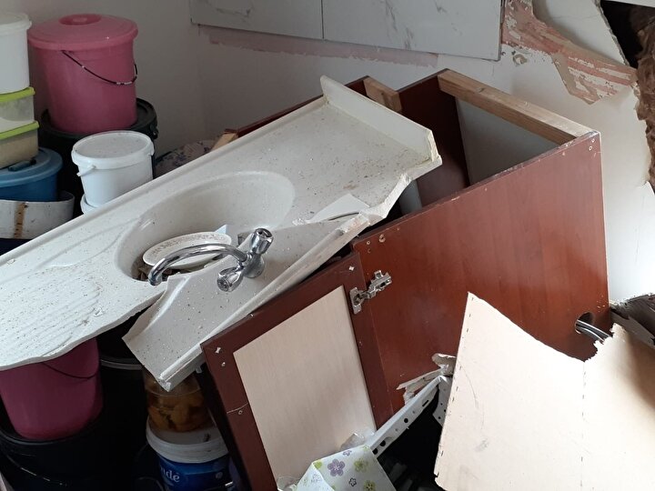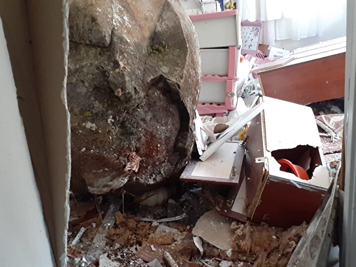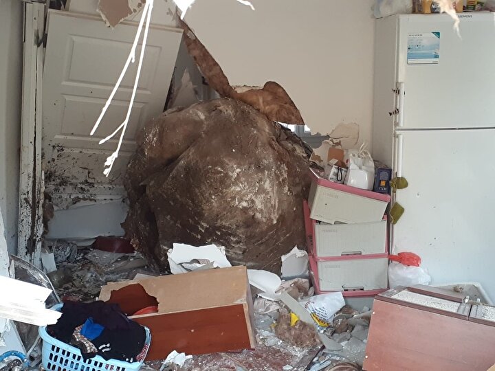 Düşen kaya önce duvarı deldi ardından salonu aşarak anne Dilek ile 7 yaşında oğlunun bulunduğu odaya kadar girdi.
