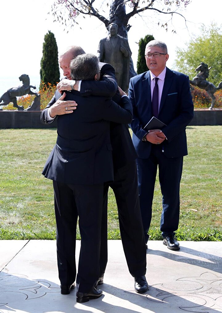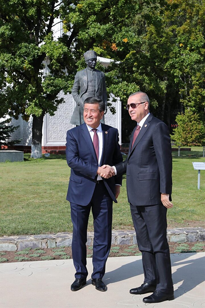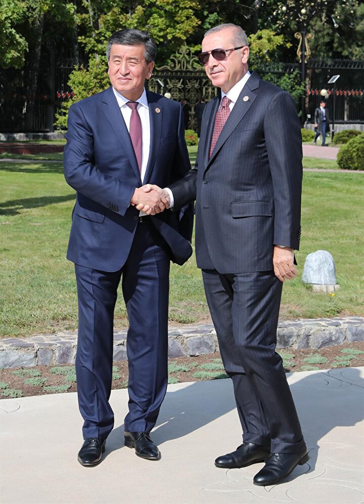 Kırgızistan Cumhurbaşkanı Sooronbay Ceenbekov, Cumhurbaşkanı Erdoğan'ı zirvenin düzenlendiği Ruh Ordo Kültür Merkezi'ne gelişinde karşıladı.