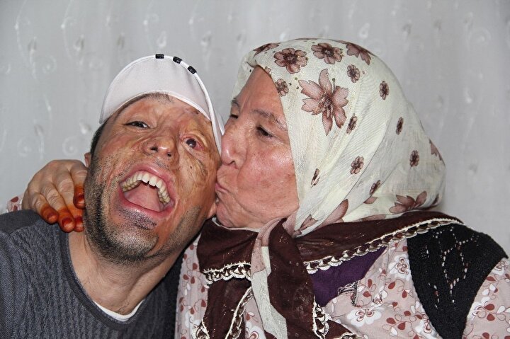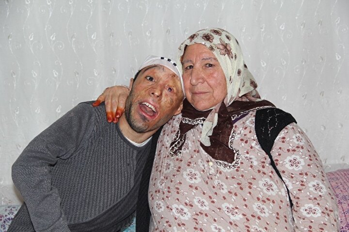 Mehmet Ali Durak’ın annesi Emine Durak, evinde çıkan yangını ve oğlu için verdiği mücadeleyi anlatarak, "Evde yoktum, süt almaya gitmiştim. Eve dönerken çatıdan dumanlar yükseldiğini gördüm. Koşarak eve girdim, çocuğumu dışarı çıkardım. Oğlumu çıkardığımda ağlama sesi bile gelmiyordu. Hemen hastaneye götürdük. Çocuğum hastanede 47 gün boyunca yoğun bakımda kaldı. Daha sonra Ege Üniversitesi Hastanesinde 1 yıl kaldı ve çok ameliyat geçirdi. O zamanda sonra hiç ameliyat yapmadılar, 18 yaşına girmesini bekledik. Biz 18 yaşına girdiğinde tekrar hastaneye götürdük ameliyat olmasını istedik. Doktorlar tedaviyi göze alamadı. Ondan sonra ufak tefek ameliyatlarla oğlumun yüzü biraz düzeltildi. Oğlumun iyi olmasını istiyorum. Yürüsün, yüzü düzelsin, her şeyini yapabilsin istiyorum. Oğlumun kafatası yok ve beyni dışarıda, onun için konuşamıyor. Şimdi oğluma iyi kötü bir şekilde bakabiliyorum. Ben öldükten sonra oğluma hiç kimse bakamaz, onun iyi olmasını istiyorum" dedi.