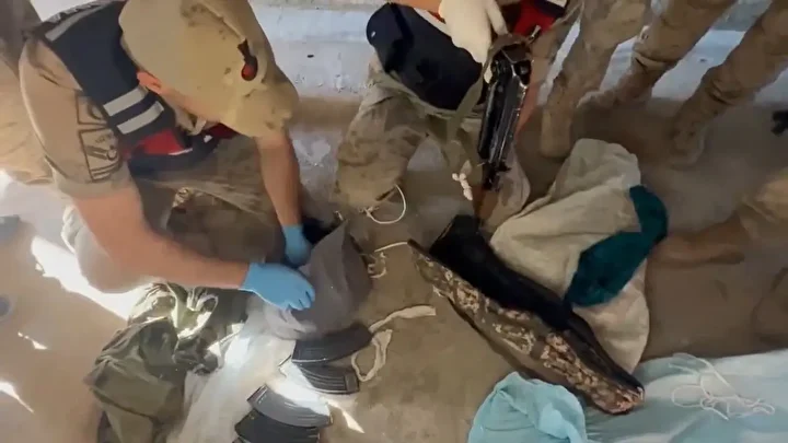 Narkotik köpeklerin de kullanıldığı aramalarda, mısır tarlasında bazalt taşlar arasına ve tezek yığını içerisine poşetler ve çuvallara gizlenmiş 7 uzun namlulu silah, 9 tabanca, 9 av tüfeği, 40 şarjör, bin 565 fişek ve 5 kilogram sentetik uyuşturucu ele geçirildi.