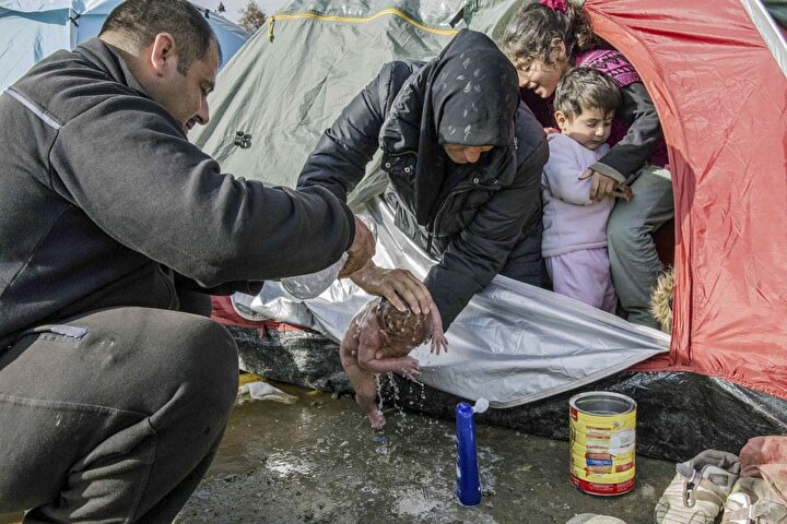 İdomeni'de doğan bebek - Yunanistan'ın, Makedonya sınırındaki İdomeni kasabasında bulunan sığınmacı bir aile, kendi kurdukları çadırda yeni doğmuş bebeklerini yıkadı. - Iker Pastor