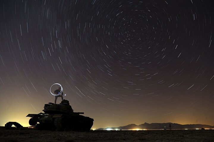 Tank ve yıldızlar - Konya'nın Karapınar ilçesindeki Milli Savunma Bakanlığı Karapınar Atış Test ve Değerlendirme Grup Komutanlığına bağlı atış alanında bulunan eski tanklar ve yıldızlar, uzun pozlamayla görüntülendi. - Yavuz Görür