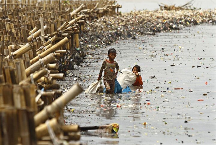 Denizden plastik çöp toplayan çocuklar - Endonezya'nın başkenti Jakarta'da denize kıyısı bulunan sahil köyünde, çocuklar dalgaların kıyıya sürüklediği plastik çöp ve atık topluyor. - Agoes Rudianto