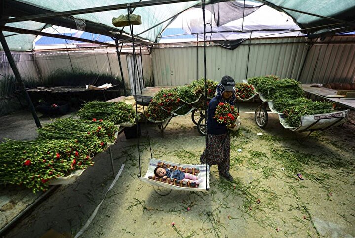 Anneler günü - Anneler Günü öncesinde Antalya'daki çiçek seralarında ve depolarında büyük bir yoğunluk yaşandı. Bir yandan çocuklarının ihtiyaçlarını karşılayan, bir yandan da dünya annelerine verilecek çiçekleri özenle hazırlayan kadınlar, hiç tanımadıkları hemcinslerinin yüzünü güldürecek çiçekleri hazırladı. Tokat'tan Antalya'ya eşi Murat Demir ile gelerek 8 yıldır çiçek seralarında çalışan Ayşe Demir, 10 aylık kızı Hira Nur'un (fotoğrafta) çiçeklerin arasında büyüdüğünü söyledi. - Süleyman Elçin