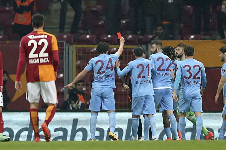 Hakeme kırmızı kart - Spor Toto Süper Lig'de Galatasaray ile Trabzonspor takımları Türk Telekom Arena'da karşı karşıya geldi. Trabzonsporlu oyuncu Salih Dursun, kararlarına tepki olarak elindeki kırmızı kartı alarak hakem Deniz Ateş Bitnel'e gösterdi. - Berk Özkan