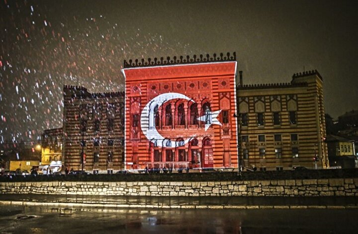 Vijecnica Kütüphanesi'ne Türk Bayrağı - Bosna Hersek'in başkenti Saraybosna'nın en önemli sembollerinden Vijecnica Kütüphanesi, Türkiye ve Belçika'daki terör saldırıları sonrası Türk ve Belçika bayraklarının renkleriyle ışıklandırıldı. - Mustafa Öztürk