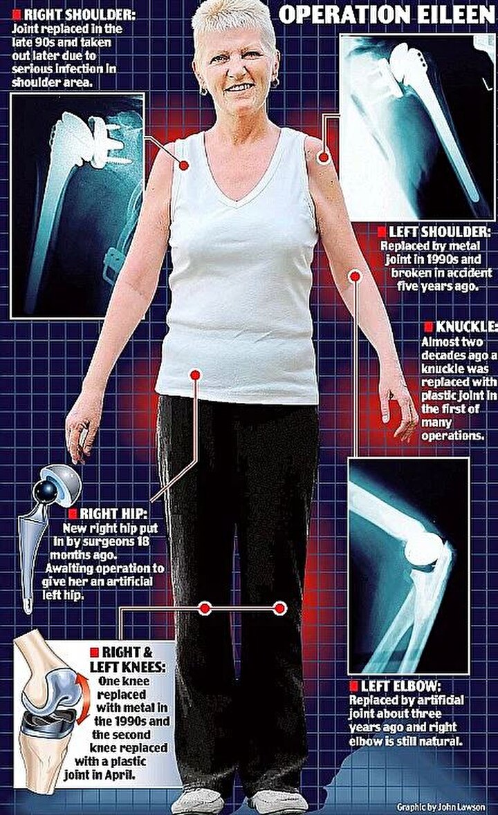İngiliz Eileen Brown, son yirmi yılda bir düzine operasyon geçirmiş. Şu anda bedeninde omuz, kalça ve dizler ve sol dirsek hariç her parça metal ya da plastik parçalarla değiştirilmiş...