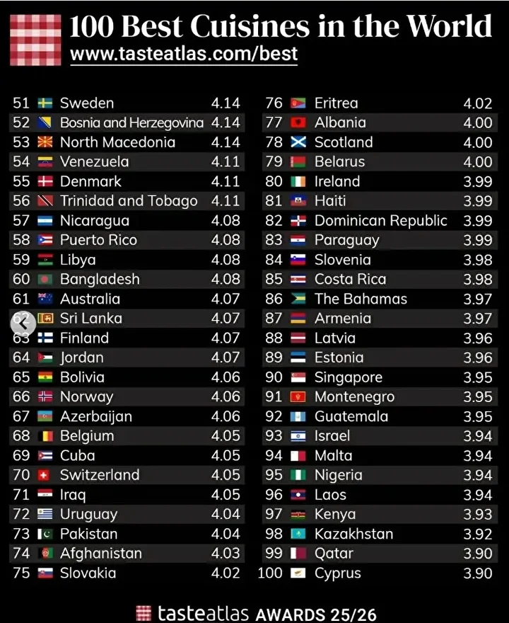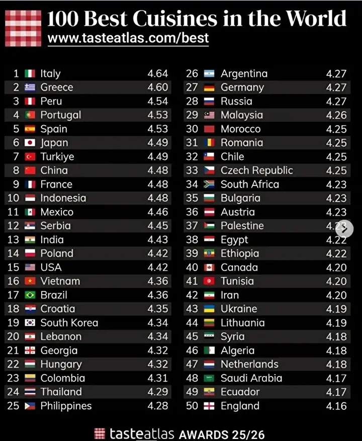 Yeme-içme kültürüne yönelik hazırladığı kapsamlı listelerle bilinen TasteAtlas, bu kez kullanıcı puanları ve gastronomi uzmanlarının değerlendirmeleriyle 2025 yılı sonunda yayınlanan "Dünyanın En İyi 100 Mutfağı" listesini duyurdu.