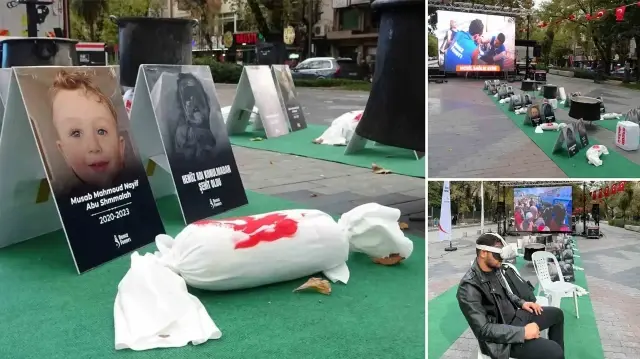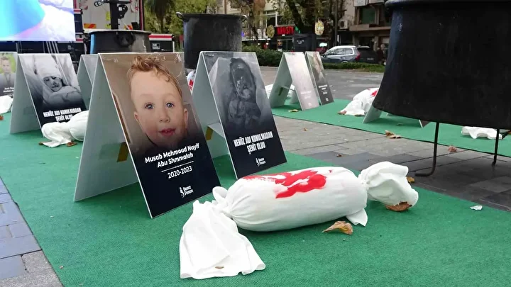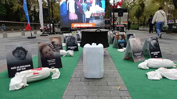 Ziyaretçiler ayrıca LED ekranlardan yapılan canlı bağlantılarla, Gazze’deki ekiplerden günlük durumu öğrenme imkanı da buluyor; böylece savaşın boyutu birebir hissediliyor. Sergi alanında yer alan minik kefenler, çocuk fotoğrafları ve oyuncaklar, savaşın en çok küçük bedenlerde açtığı yaraları hatırlatıyor. Henüz konuşamadan susturulan bebeklerin, hayalini kurduğu okula hiç gidemeyen çocukların acısı, sergi boyunca derinden hissediliyor.