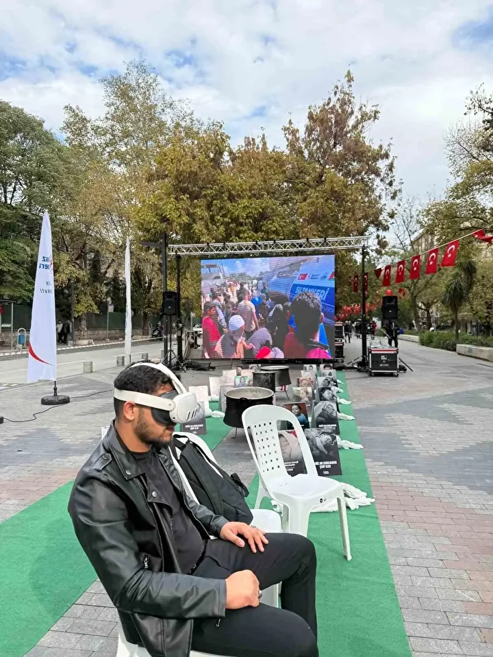 İzmit Yürüyüş Yolu’nda kurulan stantta ziyaretçileri ilk anda derin bir sessizlik karşılıyor. Ardından gelen görüntüler, sesler ve anlatılar, Gazze’de yaşanan yıkımı adeta gözler önüne seriyor. Sanal gerçeklik alanında VR gözlüklerini takan vatandaşlar, birkaç saniye içinde Gazze’nin sokaklarında, molozlar arasında yaşam mücadelesi veren insanların arasına karışıyor.