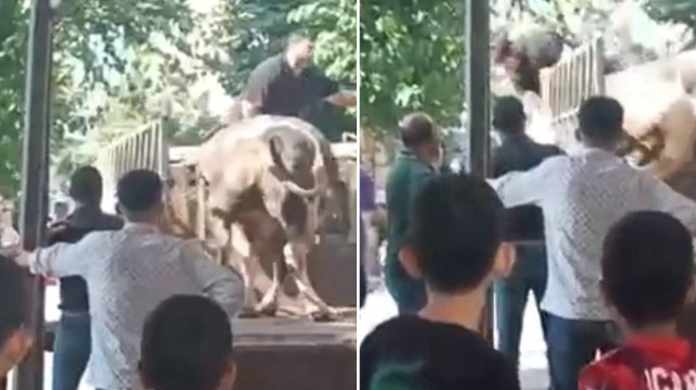 Şanlıurfa'da kurban pazarından getirilen bir boğa, kesim için kamyonetten indirildiği sırada kasaba saldırdı. Saldırı sonucu kasap İbrahim Akdemir yaralandı. Kızgın boğa, olay yerine gelen belediye görevlileri tarafından uyuşturucu iğneyle sakinleştirildi. Yaşananlar cep telefonu kamerasıyla görüntülendi.