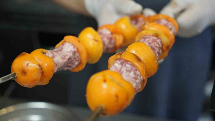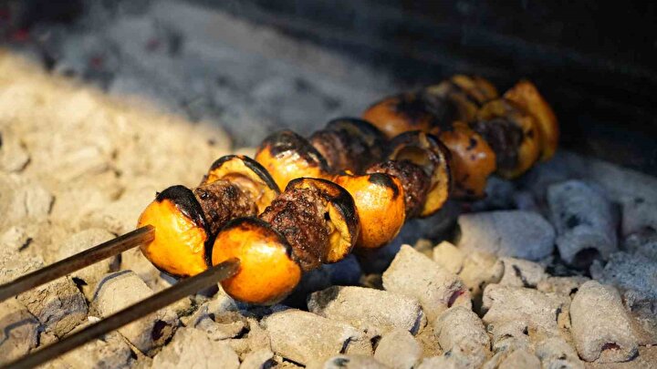 Malta eriği olarak da bilinen yenidünya meyvesi, kıymayla birlikte şişlere dizilerek ocakta pişirilirken, görüntüsü ve lezzetiyle turistlerin de ilgisini çekiyor.