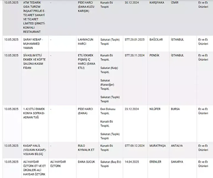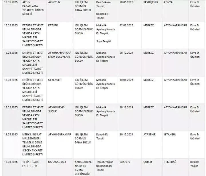 Bakanlık tarafından duyurulan listeye son olarak Sakarya, Konya, Afyonkarahisar ve İstanbul merkezli üretim gerçekleştiren firmalar dahil edilirken, hileli üretim yaptığı duyurulan firmalar arasında marketlerde satışa sunulan ünlü sucuk markası da yer aldı.