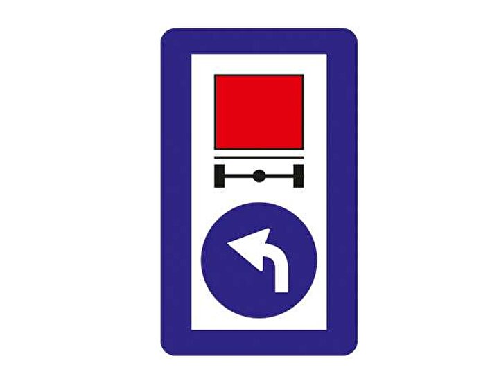 Tehlikeli madde taşıyan araçların izleyecekleri mecburi yön trafik işareti, yolda tehlikeli madde taşıyan araçların olduğunu değil, böyle bir araçsanız izleyeceğiniz yolu bildiriyor.