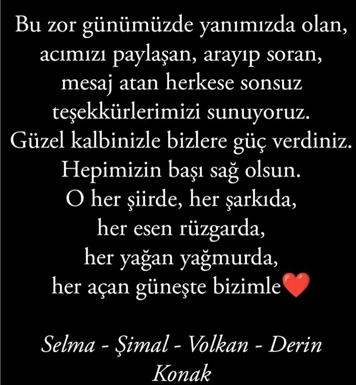 Selma Konak "Kara, kapkara bir gece... 30 Mart gecesi Türkiye Kuzeyin oğlunu, ben ise canımı kaybettim. İçim öyle acıyor ki bunu kelimelerle anlatmam imkansız. 'Bizimkisi bir aşk hikâyesi değildi. Aşk'tı bizimkisi, gerisi hikaye.' Öyle bağlıydık birbirimize ki her anımızı birlikte yaşadık, her anı birbirimize adadık. Şimdi, onsuz bir hayatı anlamaya çalışmak, kalbimdeki boşluğu hissetmek çok zor." ifadelerini kullandı.