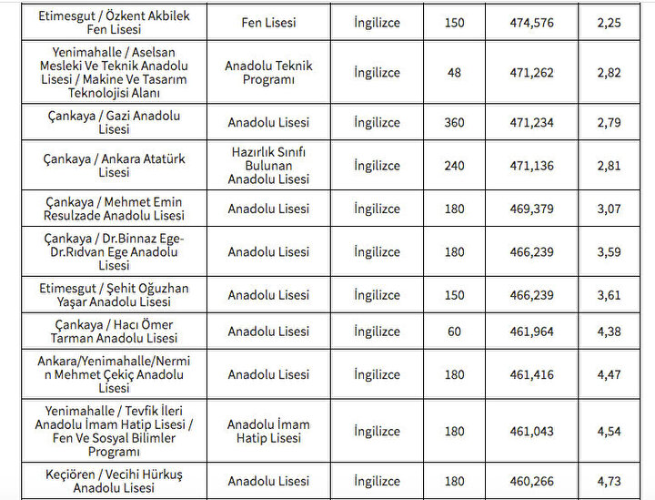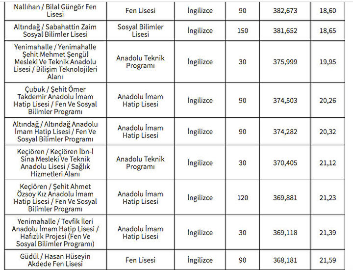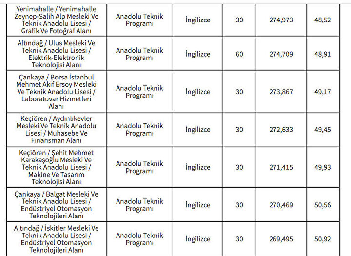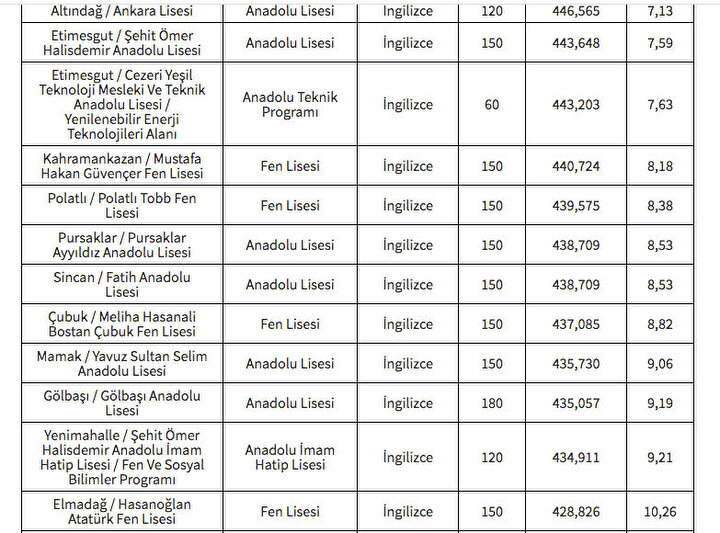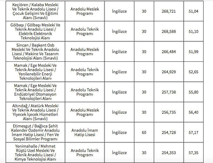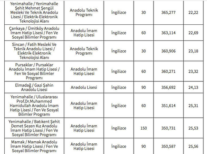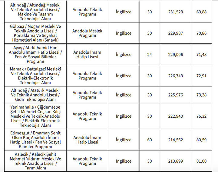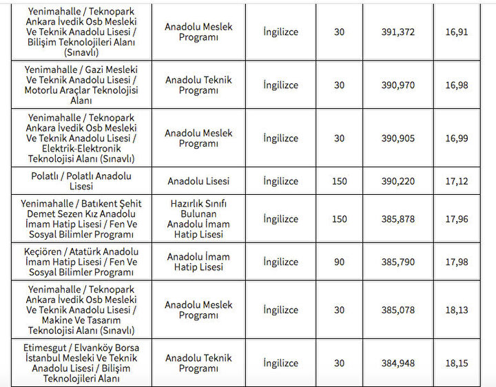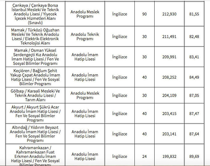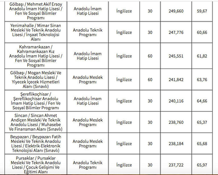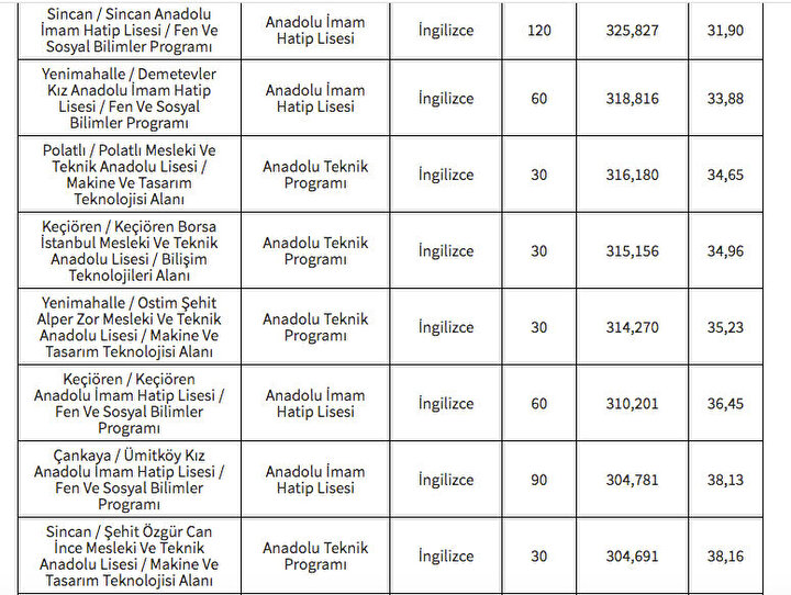 Anadolu lisesi, Mesleki ve Teknik Anadolu lisesi, Anadolu imam hatip lisesi önceki yıl taban puanları ve yüzdelik dilimleri şu şekilde olmuştu: