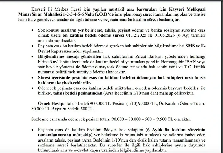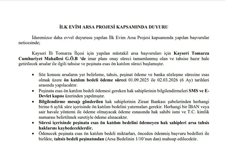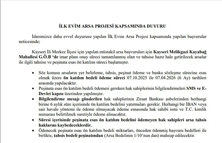 TOKİ, ilk Evim Arsa projesi kapsamında Kayseri’deki arsa tahsis bilgisine ilişkin detayları açıkladı. İlk evim arsa kampanya kapsamında, Melikgazi, Akkışla, Tomarza, Özvatan, Yahyalı, Kocasinan’daki projeler için tahsis ve peşinata esas ön katılım bedeli ödemesine ilişkin detayları paylaştı. Peki Kayseri TOKİ Arsa için son durum nedir Tahsi süreci başladı mı, ön katılım bedeli ne kadar? İşte Kayseri TOKİ ilk evim arsa tahsis tarihleri.