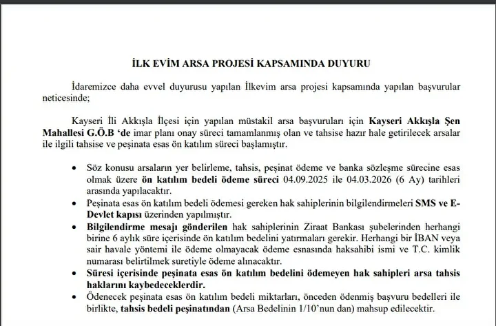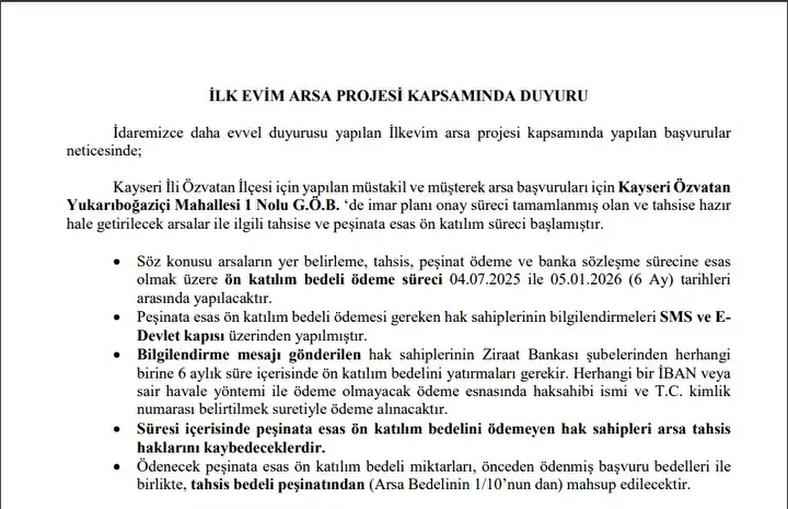 TOKİ ilk evim arsa projesi kapsamında hak sahipliği belirleme kuraları tamamlanmış olup, kura sonuçları e-Devlet'te yayınlandı. Arsalarda planlama çalışmaları devam ederken, asil hak sahibi olarak belirlenen vatandaşlara yapılacak arsa tahsis süreci ile ilgili öngörülen tarihler belirlendi. TOKİ tarafından yer belirleme, tahsis, peşinat ödeme ve banka sözleşme sürecine esas olmak üzere ön katılım bedeline ilişkin duyuru yapıldı. Peki TOKİ Kayseri müstakil arsa yerleri belli oldu mu? Arsa peşinatları ne zaman belli olacak? İşte TOKİ Kayseri müstakil ve müşterek arsa tahsis tarihi.