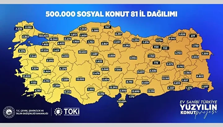 Çevre, Şehircilik ve İklim Değişikliği Bakanı Murat Kurum, 500 bin sosyal konutun 81ile dağılımını harita ile gösterdi ve şu ifadeleri kullandı; "86 milyon nüfusumuza göre 81 ilde 500 bin sosyal konutun dağılımını yaptık. Gelen talepleri ve genel ihtiyaçları dinledik değerlendirdik. İstanbul'da 100 bin konut yapıyoruz. Buna ilave yine İstanbul'da 15 bin kiralık konut yapıyoruz. Ankara, 30823 sayısıyla en fazla konut yaptığımız ikinci ilimiz olacak.