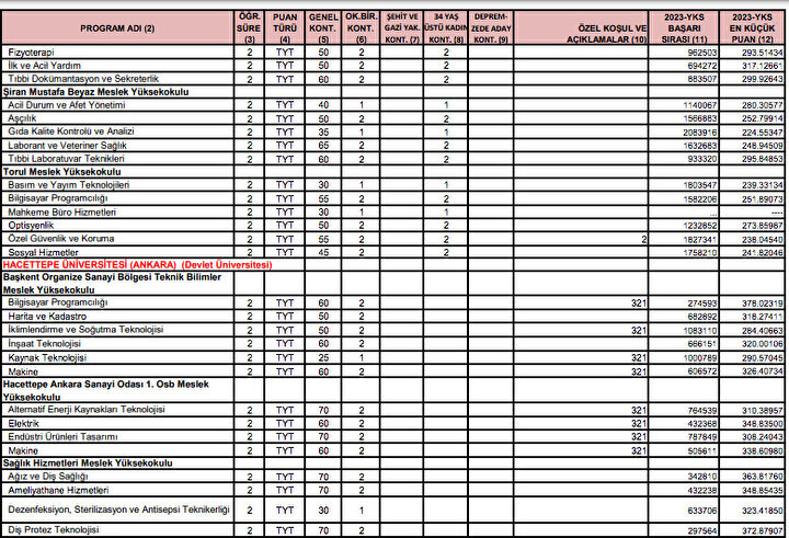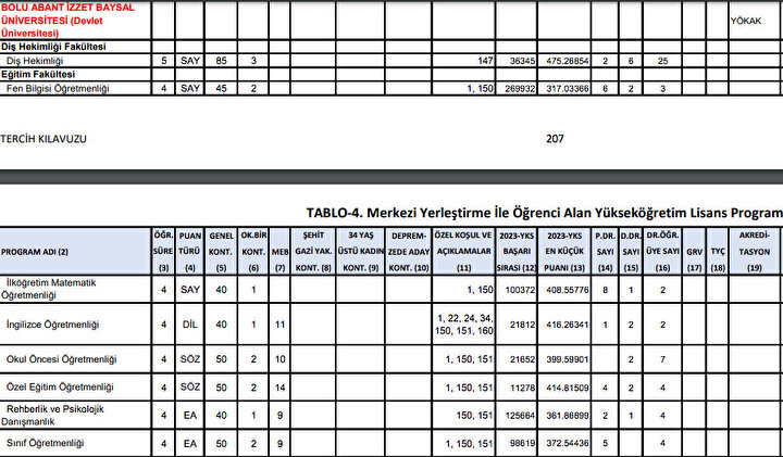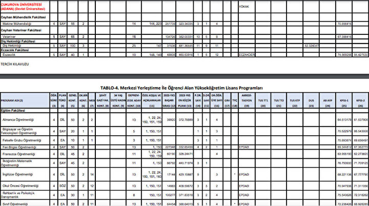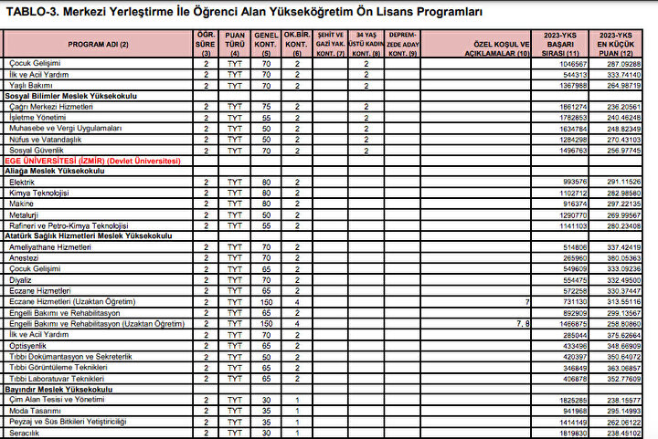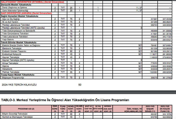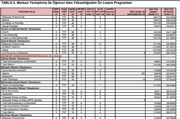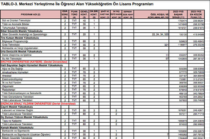 2024-YKS sonuçlarına göre yükseköğretim programlarına yapılacak yerleştirmede bu programların kontenjan ve koşulları göz önünde tutulacaktır. Bu kontenjan ve koşullar “2024-YKS Yükseköğretim Programları ve Kontenjanları Kılavuzu”nda yer alacaktır. Adaylar kılavuza 2024 Temmuz ayı içinde ÖSYM’nin http://www.osym.gov.tr internet adresinden erişebileceklerdir. Kılavuz basımı, dağıtımı ve satışı yapılmayacaktır. İşte 2023 yılı yerleştirme puanları TYT ve AYT başarı sıralamaları.