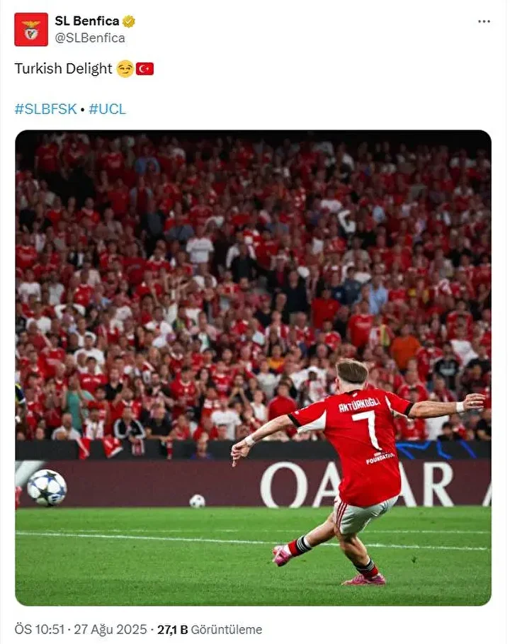 UEFA Şampiyonlar Ligi Play-Off Turu rövanş karşılaşmasında Fenerbahçe deplasmanda Benfica’nın konuğu oldu. Sarı lacivertliler 36. dakikada Kerem Aktürkoğlu'nun ayağından yediği golle 1-0 geriye düştü. Benfica'nın paylaşımı ise sosyal medyaya damga vurdu.