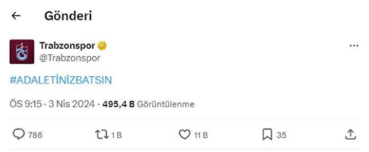 Trabzonspor verilmeyen penaltı sonrasında sosyal medya hesabından 'Adaletiniz batsın' paylaşımında bulundu.