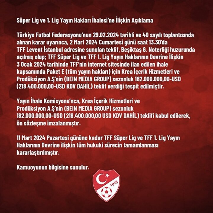 TFF, Süper Lig ve 1. Lig yayın hakları için beIN SPORTS ile yıllık 182 ml $ (KDV dahil 218.4 ml $) karşılığında anlaşma sağlandığını açıkladı.