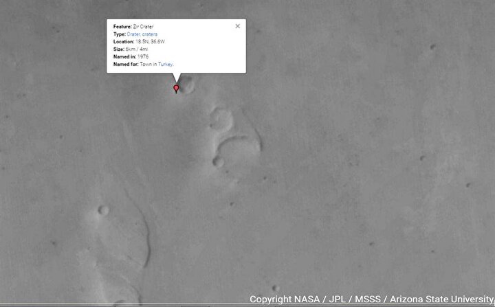 18) ZİR: Mars yüzeyinde 34 derece güney, 42 derece batı koordinatlarında yer alıyor. 6 kilometre çapında. Bu isim kratere 1976’da verildi.