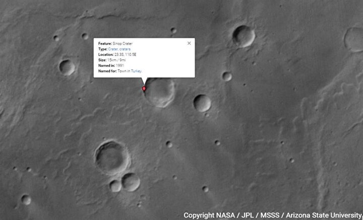16) SİNOP: 23,5 güney, 249,5 batı koordinatlarında yer alıyor. 15 kilometre çapında. 1991’de bu isim verildi.